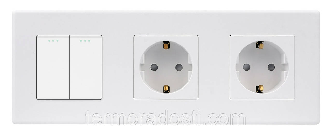 - Компактність і функціональність: Об'єднання одного вимикача та двох розеток в одному пристрої економить місце та забезпечує зручність використання, особливо в приміщеннях з обмеженим простором.