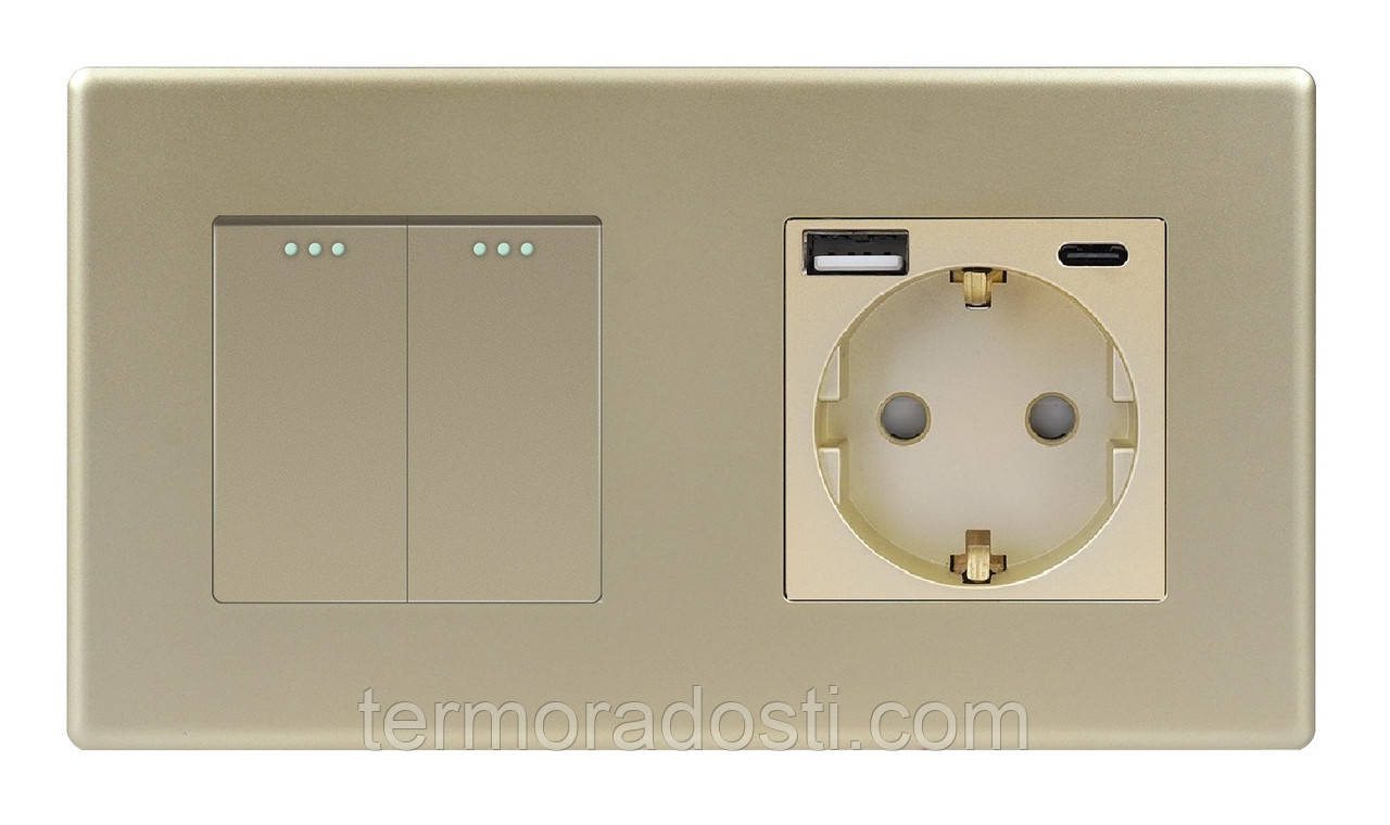 Вимикач (2кл.) + Розетка USB і Type-C 1DAL | Золото (P157-SW2G-STUTC.GD)